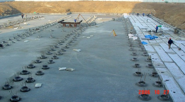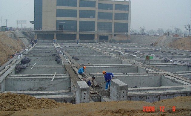 根據(jù)地基承載力驗(yàn)算,新基礎(chǔ)采用筏板基礎(chǔ)即可滿足要求,但其沉降量較大。為控制新舊基礎(chǔ)的沉降差,新基礎(chǔ)采用了筏板加防沉樁的基礎(chǔ)形式,在主樓部分的下軌道梁即縱向基礎(chǔ)梁下部增加了防沉樁,以減小新基礎(chǔ)的沉降量。