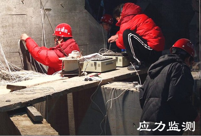 在平移施工前及平移施工過程中,隨時(shí)監(jiān)測(cè)托換梁的應(yīng)力及整個(gè)建筑物的沉降、傾斜、振動(dòng)情況等。