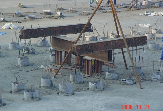 動(dòng)力施加:      建筑物前后分別由兩臺(tái)變頻泵站為千斤頂提供動(dòng)力,由一臺(tái)工業(yè)控制計(jì)算機(jī)通過兩個(gè)PLC控制柜同步控制所有千斤頂。    根據(jù)實(shí)時(shí)監(jiān)測(cè)記錄,建筑物啟動(dòng)時(shí)牽引力為20500kN,約為建筑物總重的1/17.5,正常行走牽引力為10600 kN~13000kN,約為建筑物總重的1/27 ~1/33。 就位連接:      該建筑物平移到位后,墻、柱用連接鋼筋將截?cái)嗝嫔?、下預(yù)埋鋼筋焊接連接。上、下軌道梁之間的空隙用自密實(shí)微膨脹混凝土澆灌密實(shí),保留柱四周的外包梁及墻下?lián)Q梁,上軌道體系的其余部分切除,恢復(fù)地下室的使用功能。