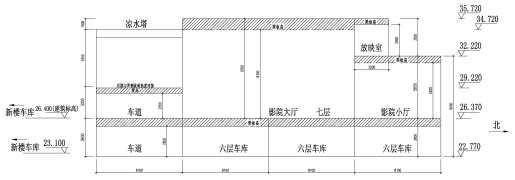 根據(jù)經(jīng)營(yíng)要求,建筑物東側(cè)單體需進(jìn)行加層改造,加層后,原五層頂屋面變?yōu)榱鶎?,作為車?kù)或經(jīng)營(yíng)使用,原五層新世紀(jì)影城搬遷至新建七層。加層設(shè)計(jì)時(shí),結(jié)構(gòu)標(biāo)高布置需在滿足影廳凈高要求的同時(shí)兼顧新加樓層與周邊建筑物車道的交通銜接、屋頂涼水塔、影院放映廳、已有樓梯、電梯等,平面、剖面布置較為復(fù)雜,剖面見(jiàn)圖2。