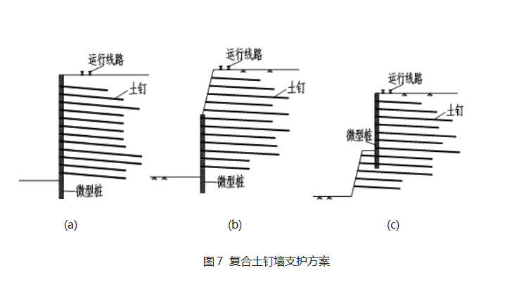 (3)方案三:考慮到以上方案的優(yōu)缺點,我單位提出基坑上部采用微型樁+土釘錨桿的擋土墻形式,下部采用傳統(tǒng)土釘墻形式(圖3c),該方案得到建設單位和監(jiān)理單位的認可,并獲得實施。該方案