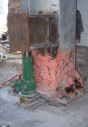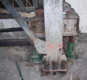 由于礦井凍結(jié)法施工造成后期井口附房產(chǎn)生較大沉降,影響了上部結(jié)構(gòu)的使用。采用頂升法對鋼結(jié)構(gòu)廠房中的沉降較大的鋼柱進(jìn)行糾偏,該方面需要在鋼柱腹板上焊接鋼牛腿提供頂升支點(diǎn),同時對鋼柱底部預(yù)埋的螺栓桿體加長,每個鋼柱兩側(cè)設(shè)置兩個頂升千斤頂,經(jīng)過頂升糾偏后該鋼結(jié)構(gòu)廠房基本恢復(fù)原狀。