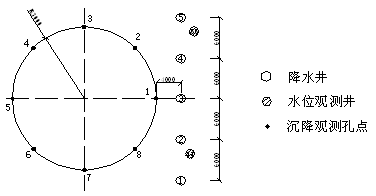 根據(jù)傾斜觀測(cè)結(jié)果沿?zé)焽枳畲髢A斜方向的垂直方向?qū)ΨQ設(shè)置5個(gè)降水井(圖2),沉降觀測(cè)點(diǎn)沿?zé)焽璧撞恐荛L(zhǎng)范圍等距離布置。經(jīng)過(guò)合理的設(shè)計(jì)和精心施工,整個(gè)糾偏工作取得圓滿成功,煙囪的傾斜率達(dá)到并穩(wěn)定在合同規(guī)定的0.8‰之內(nèi)。