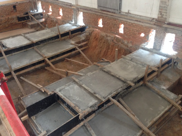 該建筑既有基礎(chǔ)形式為柱下鋼筋混凝土獨立基礎(chǔ),一層填充墻砌筑在毛石條形基礎(chǔ)上。將既有基礎(chǔ)沿平移方向延伸,作為建筑物平移就位后的基礎(chǔ)。在基礎(chǔ)頂澆筑建筑平移的下軌道。