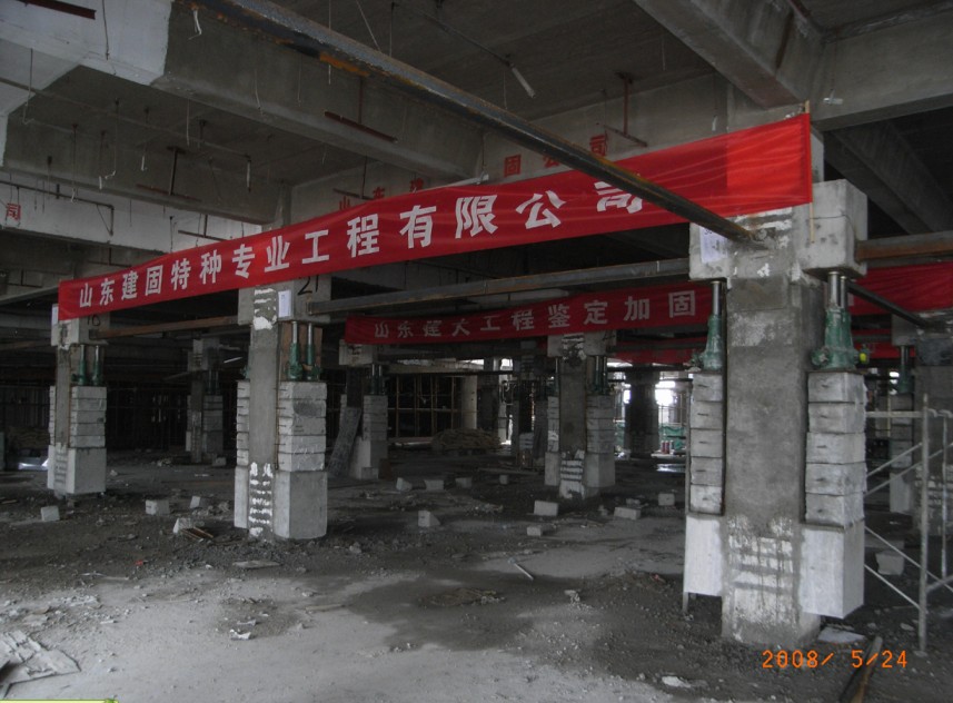 濟寧銀座商場(原華聯(lián)商廈)二期,為四層(局部六層)框架結(jié)構(gòu),建于1992年。原設計該建筑物的四層和五層層高為2.9m,現(xiàn)已不能滿足使用要求,每層需整體抬升1.1m