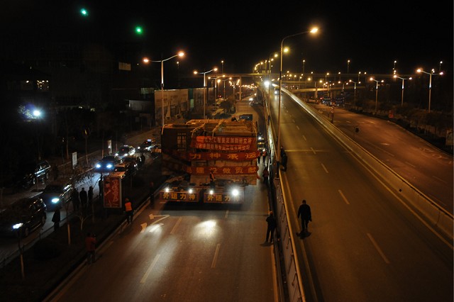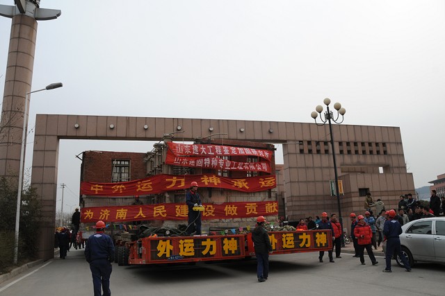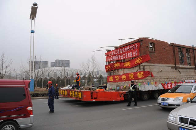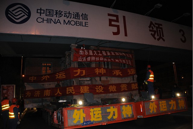 該建筑原位于繁華市區(qū),為了盡量減輕道路交通壓力, 對運(yùn)輸線路進(jìn)行了詳細(xì)勘察,遷移于3月1日21:38分開始,遷移過程中,老別墅四次屈身過街天橋,三過立交,于3月2日11:43安全到達(dá)山東建筑大學(xué)新校區(qū)。整個(gè)遷移過程歷時(shí)14小時(shí),遷移距離為30公里。