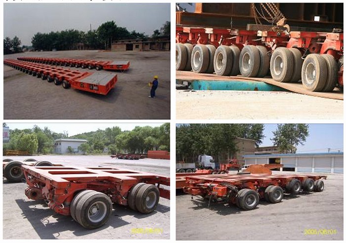 該大型液壓平板拖車,由載重部分和牽引部分組成,自身具有動(dòng)力裝置。