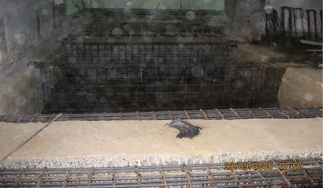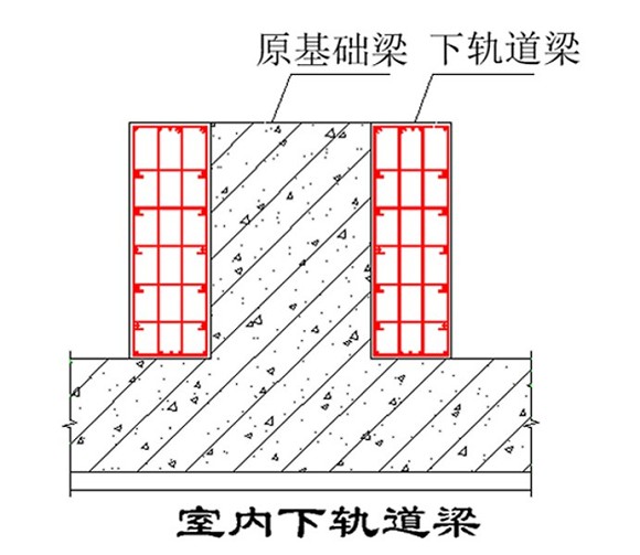 該建筑物的原基礎(chǔ)是筏板基礎(chǔ),平移時(shí)利用原有的基礎(chǔ),將縱向基礎(chǔ)梁兩側(cè)加寬,既是對原基礎(chǔ)進(jìn)行加固,又可控制新舊基礎(chǔ)的沉降差。