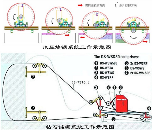 柱截?cái)嗖捎勉@石鏈鋸系統(tǒng);墻體截?cái)嗖捎冒胱詣油七M(jìn)式墻鋸系統(tǒng)。
