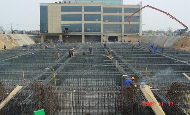 該建筑為框架—剪力墻結(jié)構(gòu),由主樓和裙樓兩部分組成,主樓地下1層,地上15層,裙樓地下1層,地上3層,長72.8m,寬41.3m,占地面積2700m2,總建筑面積24000m2,總高度67.6m, 基礎(chǔ)采用筏板基礎(chǔ)。