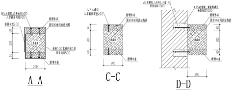 建筑物最初作為倉(cāng)庫(kù)使用,棚戶區(qū)改造后作為歷史保護(hù)建筑規(guī)劃為官扎營(yíng)基督教堂。加固設(shè)計(jì)本著修舊如舊的思路,在盡量保留建筑原貌且滿足使用功能要求的前提下采取必要的加固處理措施:對(duì)承重木架進(jìn)行受力分析(木架加固平面見(jiàn)圖3、立面見(jiàn)圖4),對(duì)承載力不足的木架柱采取新增截面方式進(jìn)行加固(圖5中A-A、C-C斷面),通過(guò)外包碳纖維箍、增設(shè)木螺釘、結(jié)合面涂結(jié)構(gòu)膠的措施使新舊截面緊密結(jié)合共同受力;木架柱加固的同時(shí),加強(qiáng)維護(hù)磚墻與木架柱的拉結(jié)(圖5中D-D斷面),提高圍護(hù)墻的穩(wěn)定性;木架上部缺陷桿件同樣采用新增截面的加固方式,并更換不滿足受力要求的木框架鋼拉桿;山墻內(nèi)側(cè)增設(shè)圈梁構(gòu)造柱,屋面標(biāo)高處新增與山墻拉結(jié)的水平支撐,提高山墻抗風(fēng)能力及平面外穩(wěn)定性;屋面整體維修,新加次檁條,次檁條上鋪設(shè)20厚木望板,木望板上設(shè)掛瓦條及順?biāo)畻l,保留原瓦,更換壞瓦。