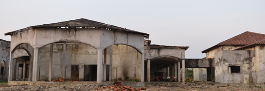 伊豐度總統(tǒng)行宮項(xiàng)目為2006年剛果(布)國(guó)慶配套工程,占地101200m2,由一個(gè)主樓加上兩個(gè)單層別墅組成。其中1#主樓建筑面積為2700 m2,主體為一層、局部二層,一層層高約為5米,大廳處層高約為8米,結(jié)構(gòu)形式為混凝土柱、梁及150厚空心砌塊墻承重,木屋頂結(jié)構(gòu)(局部現(xiàn)澆板屋頂),見(jiàn)圖32~35?,F(xiàn)大部分圖紙缺失,混凝土強(qiáng)度等級(jí)、砌體材料強(qiáng)度等級(jí)不詳。該國(guó)建筑物不考慮抗震設(shè)防要求。2006年由本地建筑單位承建,由于各種原因中途停工至今,現(xiàn)剛果(布)大工委指派威海國(guó)際經(jīng)濟(jì)技術(shù)合作股份有限公司進(jìn)行維修與續(xù)建,項(xiàng)目組對(duì)現(xiàn)狀進(jìn)行勘察后發(fā)現(xiàn)該工程施工質(zhì)量差,且長(zhǎng)時(shí)間暴曬雨淋導(dǎo)致屋架腐爛、梁柱板鋼筋嚴(yán)重銹蝕,存在重大安全隱患,為保證結(jié)構(gòu)安全,委托我所對(duì)該工程進(jìn)行鑒定并出具加固方案。