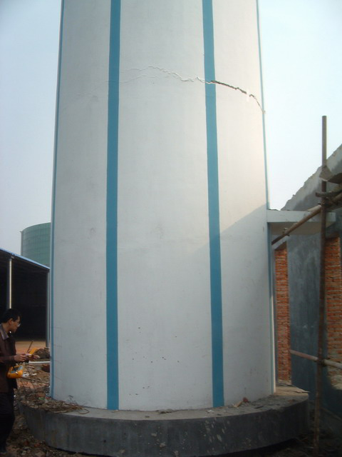 山東金明玻璃纖維有限公司水塔,為鋼筋混凝土倒錐殼水塔,設計采用04S801-2《鋼筋混凝土倒錐殼保溫水塔》中200m3 ,20m高標準圖,實際施工時根據(jù)實際情況高度變?yōu)?5m。支筒采用鋼筋混凝土支筒,半徑(外徑)為1600mm,筒壁厚度為180mm,混凝土采用C30。支筒結構于2007年完工。由于該支筒局部出現(xiàn)裂縫(圖4~6)。